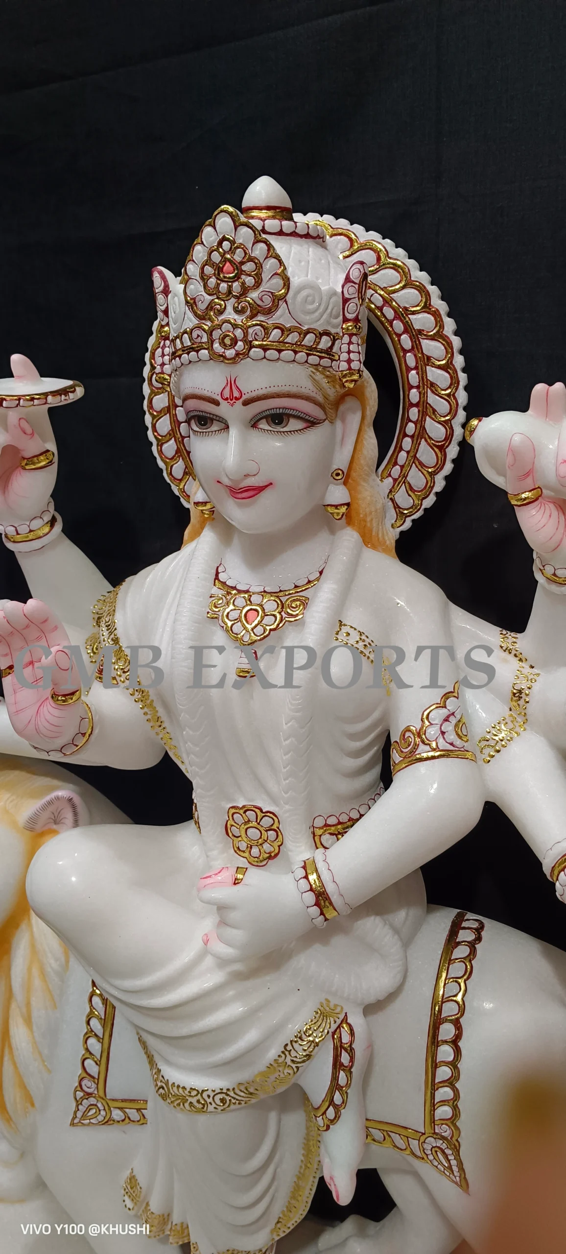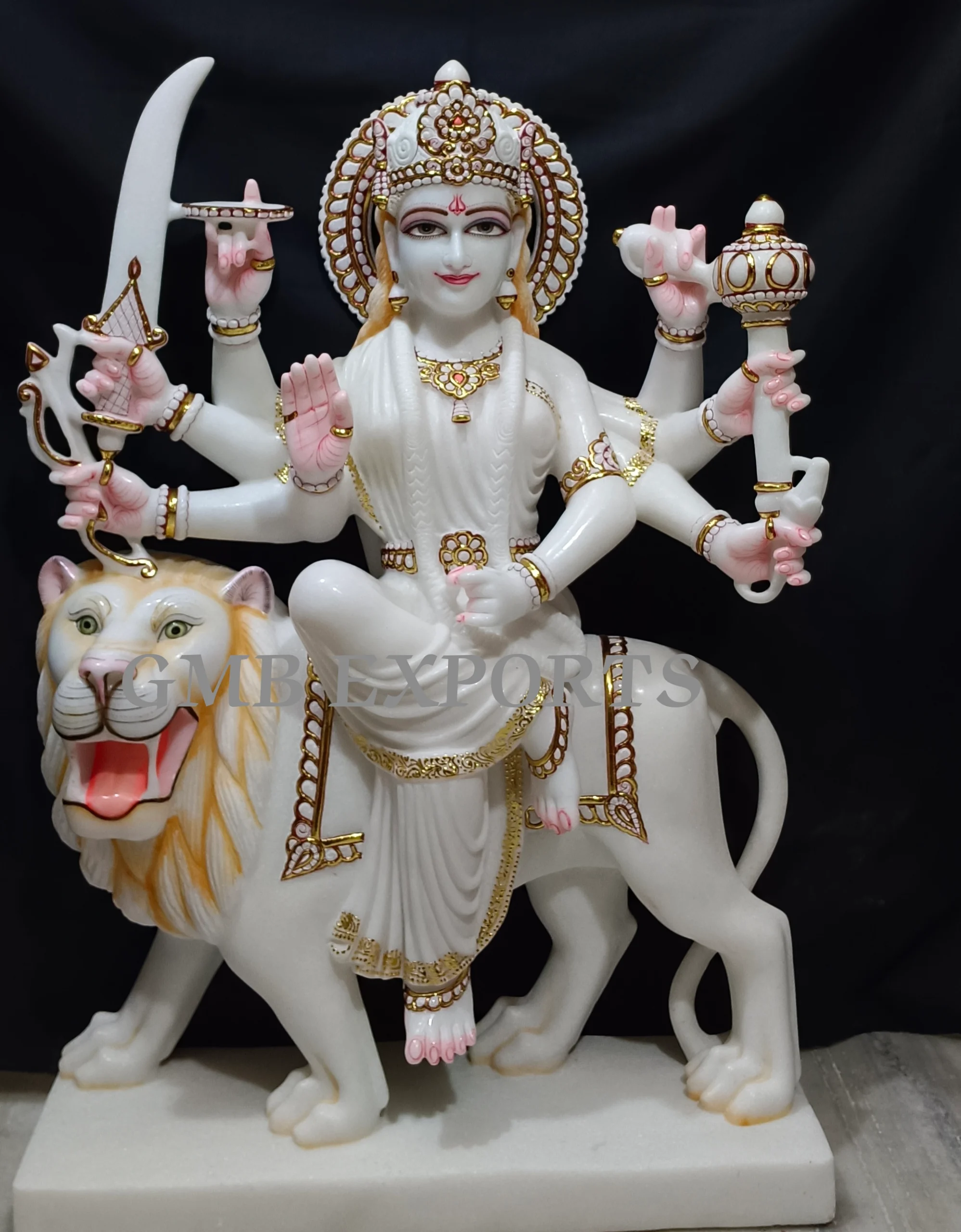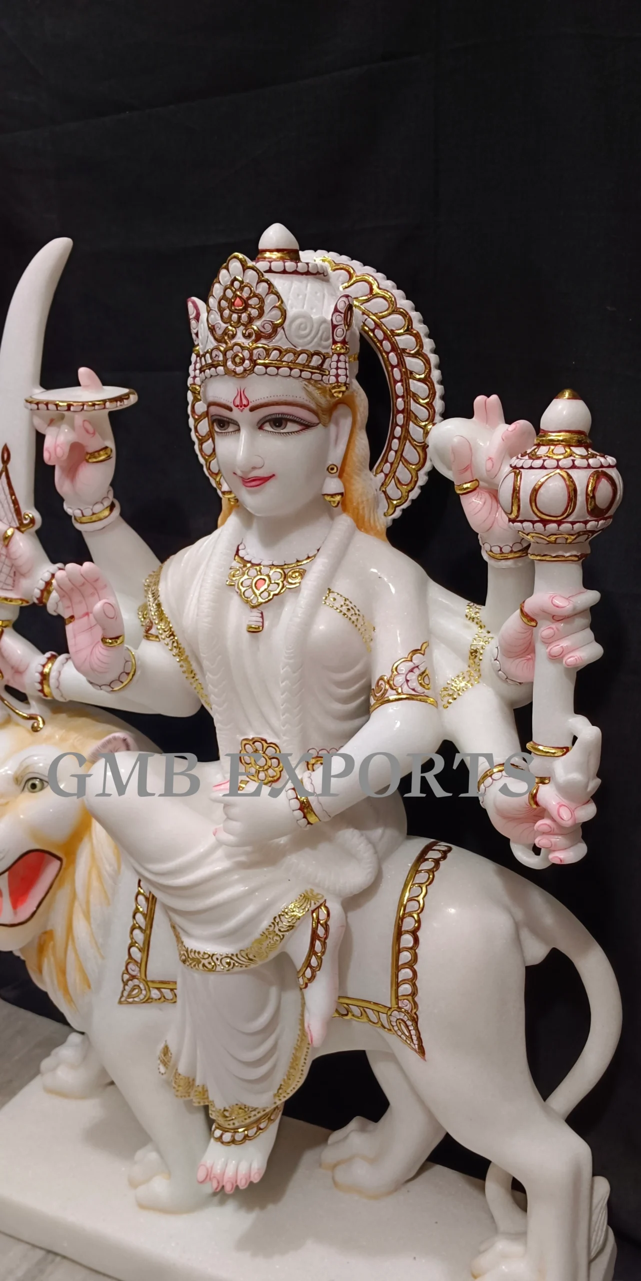 Beautiful Durga Mata white marble statue handcrafted by GMB Exports using premium Makrana and Vietnam marble. Finely detailed, smooth finished, and crafted by skilled artisans to bring divine grace and purity to any space